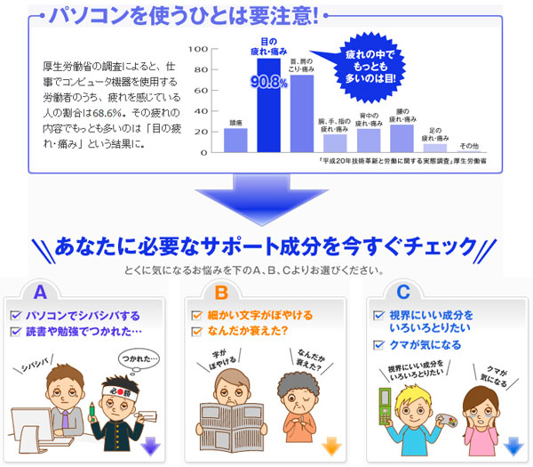 น้ำหนักรวมทุกวัน 620mg (Contents 360mg) บลูเบอร์รี่ (Bilberry) สารสกัดผง (anthocyanin 36%) 170mg, Total Carotenoids 2mg, Lutein 0.6mg, Vitamin B1 2mg, Vitamin B2 0.4mg, วิตามิน B6 2mg, วิตามินบี 12 40μg, 156mg น้ำมันสะระแหน่ (α - linolenic acid เป็น 85.8mg) [บลูเบอร์รี่หลัก] ส่วนผสม (Bilberry) สารสกัดผง, carotenoids, ดาวเรือง (ที่มีลูทีน), วิตามิน B1, วิตามิน B6, วิตามิน B2 วิตามินบี 12 -- น้ำมัน -- และ mint ขี้ผึ้งเจลาติน, กลีเซอรีน